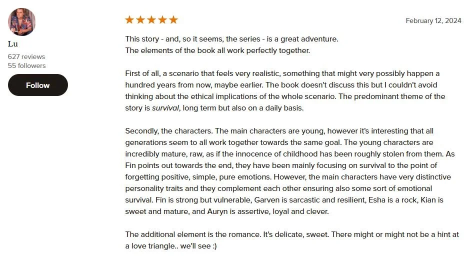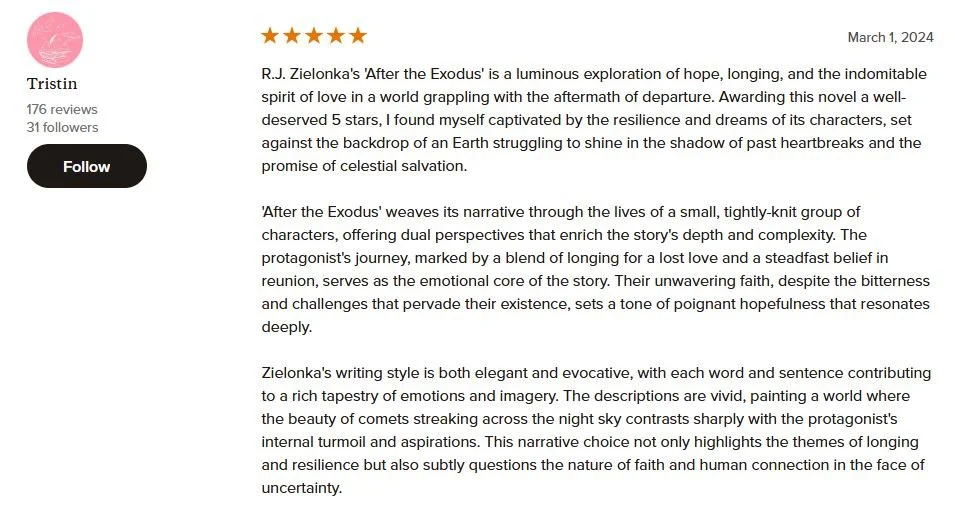 After the Exodus is a dual POV book following Finley’s harrowing journey on a dying planet Earth, hoping to survive long enough for Auryn and the crew of the Earhart to make it back and save them.